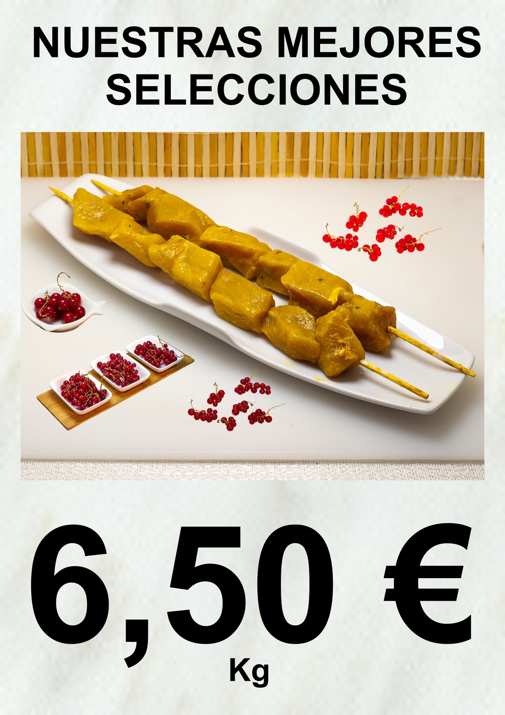 Poster publicitario digital para apoyo en venta con foto de 2 pinchitos andaluz de cerdo en fuente de diseño de porcelana decorado con surtido de grosellas . Es un archivo digital, lo cual le permite imprimirlo varias veces, es editable, por lo cual le puede por ejemplo cambiar el precio según mercado, imprimirlo desde su pc con su impresora a tamaño folio o doble folio (A3), o mandar a imprimir hasta un tamaño gran formato A0 de un metro cuadrado.