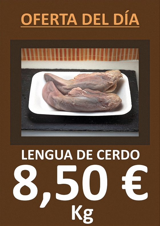 Poster publicitario digital para apoyo en venta con foto de lengua de cerdo en bandeja de corcho blanca . Es un archivo digital, lo cual le permite imprimirlo varias veces, es editable, por lo cual le puede por ejemplo cambiar el precio según mercado, imprimirlo desde su pc con su impresora a tamaño folio o doble folio (A3), o mandar a imprimir hasta un tamaño gran formato A0 de un metro cuadrado.