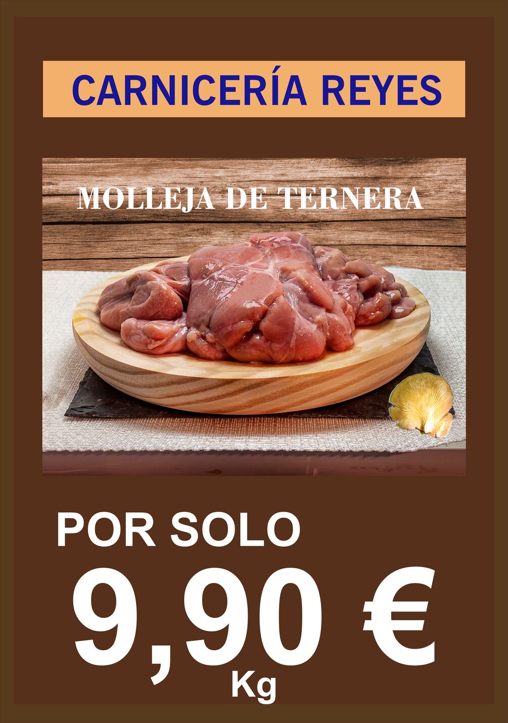 Poster publicitario digital para apoyo en venta con foto molleja de ternera sobre tabla de picar de madera . Es un archivo digital, lo cual le permite imprimirlo varias veces, es editable, por lo cual le puede por ejemplo cambiar el precio según mercado, imprimirlo desde su pc con su impresora a tamaño folio o doble folio (A3), o mandar a imprimir hasta un tamaño gran formato A0 de un metro cuadrado.