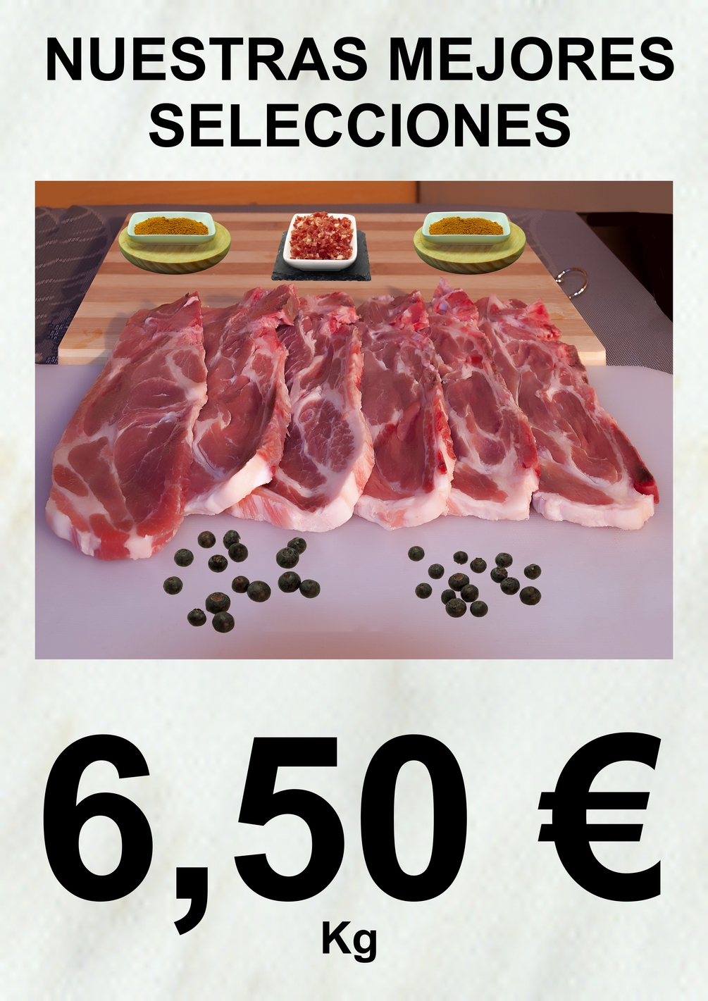 Poster publicitario digital para apoyo en venta con foto de chuletas de aguja de cerdosobre fondo neutro y fuentecitas de cúrcuma y taco de jamón al fondo . Es un archivo digital, lo cual le permite imprimirlo varias veces, es editable, por lo cual le puede por ejemplo cambiar el precio según mercado, imprimirlo desde su pc con su impresora a tamaño folio o doble folio (A3), o mandar a imprimir hasta un tamaño gran formato A0 de un metro cuadrado.