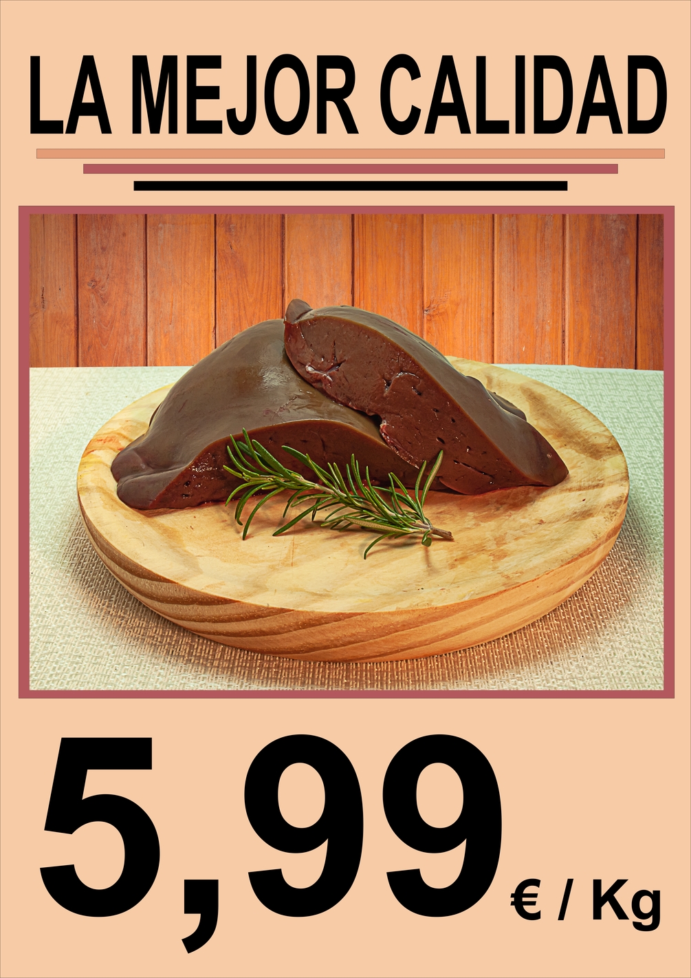Cartel con foto de hígado de cordero sobre tabla de picar.