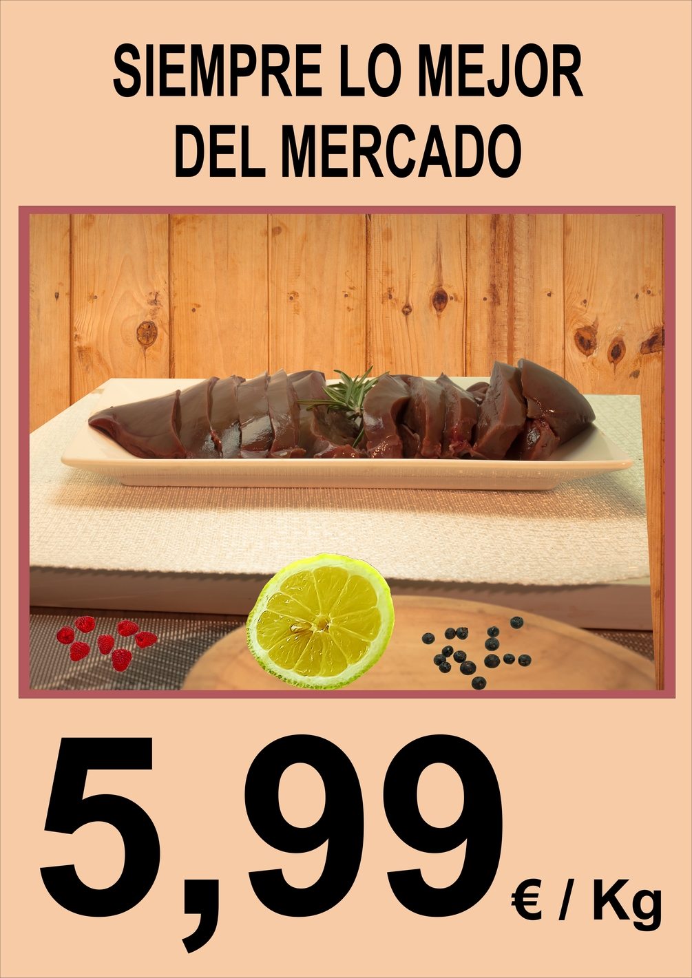 Poster publicitario digital para apoyo en venta con foto de higadito de cordero sobre fuente de porcelana blanca. Es un archivo digital, lo cual le permite imprimirlo cuantas veces lo necesite, es editable, por lo cual le puede por ejemplo cambiar el precio según mercado, imprimirlo desde su pc con su impresora a tamaño folio o doble folio (A3), o mandar a imprimir hasta un tamaño gran formato A0 de un metro cuadrado.