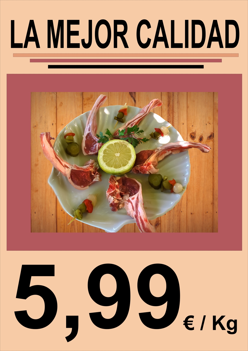 Poster publicitario digital para apoyo en venta con foto de chuletitas de cordero sobre una fuente en concha . Es un archivo digital, lo cual le permite imprimirlo varias veces, es editable, por lo cual le puede por ejemplo cambiar el precio según mercado, imprimirlo desde su pc con su impresora a tamaño folio o doble folio (A3), o mandar a imprimir hasta un tamaño gran formato A0 de un metro cuadrado.